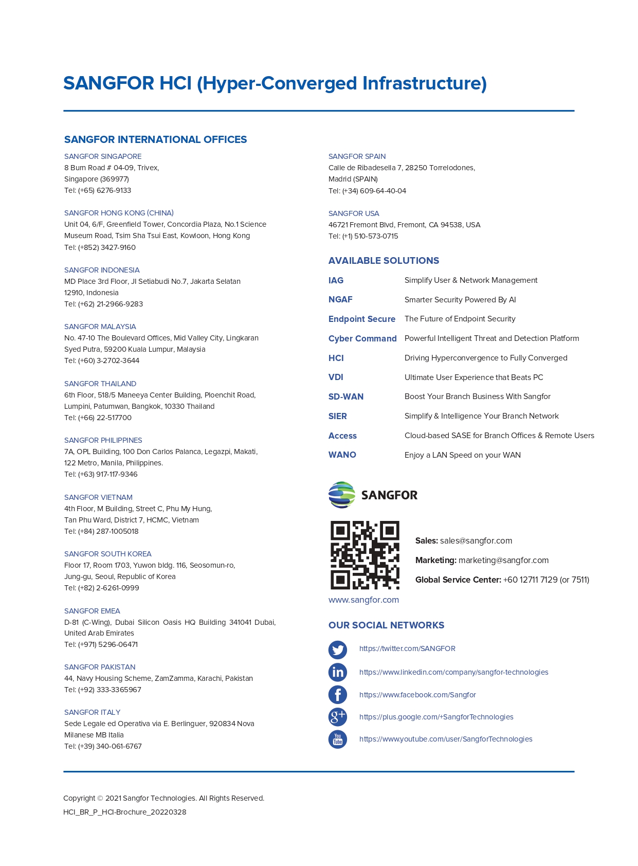 Sangfor có hơn 20 năm kinh nghiệm về bảo mật và tối ưu hóa mạng và là nhà cung cấp châu Á duy nhất có 6 sản phẩm (HCI, NGAF, WANO, IAG, AD và SSL VPN) trong Gartner Magic Quadrant. Việc đầu tư R&D vào ảo hóa bắt đầu từ năm 2011 và năm tiếp theo Máy tính ảo (VDI) đã được triển khai thương mại thành công